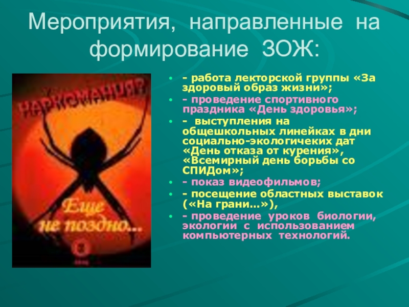 Слайд 10Мероприятия, направленные на формирование ЗОЖ: