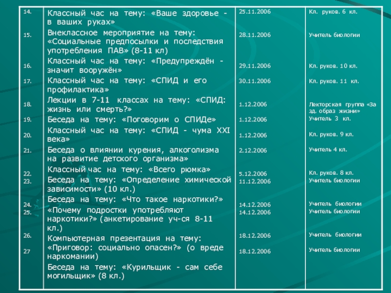 - выступления на общешкольных линейках в дни социально-экологичеких дат «День отказа от курения», «Всемирный день борьбы со СПИДом»;