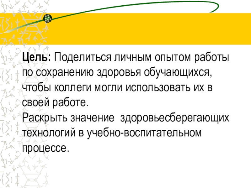 Слайд 2Цель: Поделиться личным опытом работы по сохранению здоровья обучающихся, чтобы коллеги