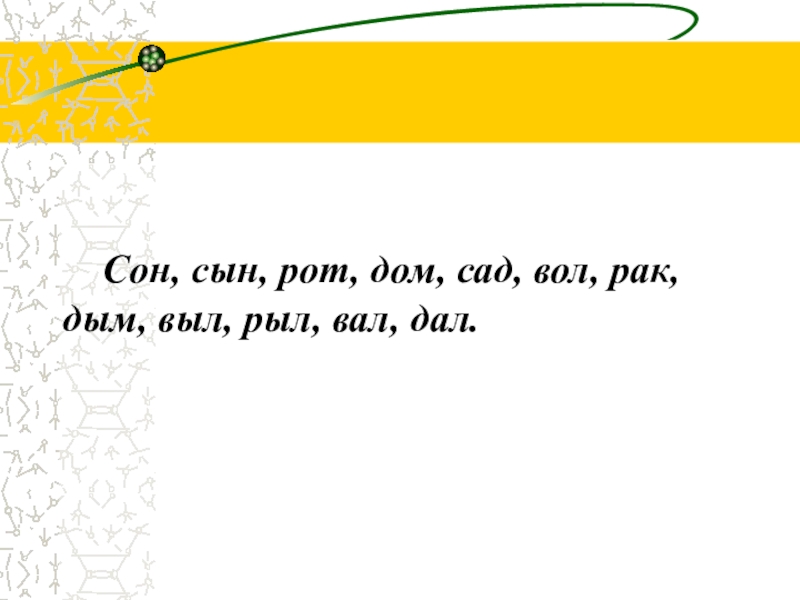 Слайд 10Сон, сын, рот, дом, сад, вол, рак, дым, выл, рыл, вал,