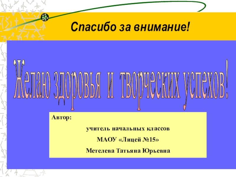 Спасибо за внимание!Желаю здоровья и творческих успехов! Автор: учитель начальных классов МАОУ «Лицей №15»Метелева Татьяна Юрьевна