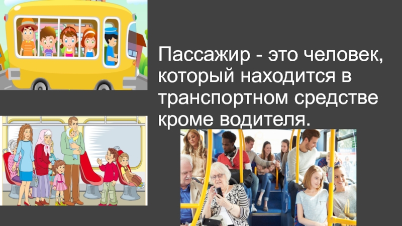 Слайд 13Пассажир - это человек, который находится в транспортном средстве кроме водителя.