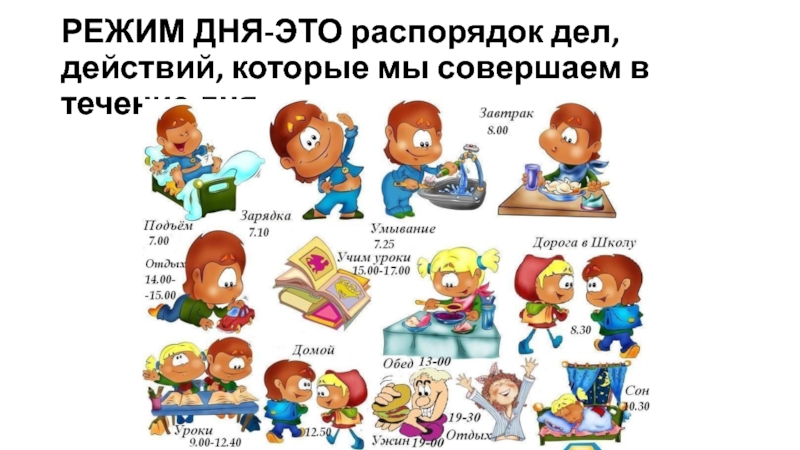 Слайд 9РЕЖИМ ДНЯ-ЭТО распорядок дел, действий, которые мы совершаем в течение дня.