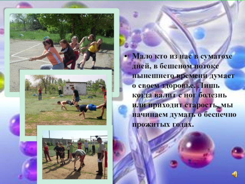 времени думает о своем здоровье. Лишь когда валит с ног болезнь или приходит старость, мы начинаем думать о беспечно прожитых годах.