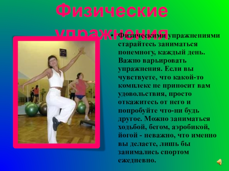 Физическими упражнениями старайтесь заниматься понемногу, каждый день. Bажно варьировать упражнения.