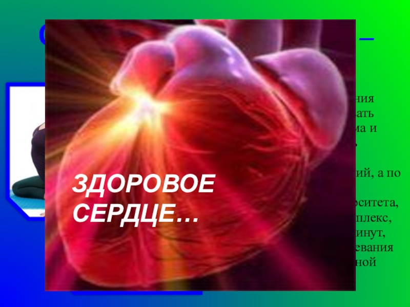 организма и уменьшают опасность развития сердечно - сосудистых заболеваний, а по мнению ученых Бристольского Университета, даже простейший комплекс, рассчитанный на 15 минут, сокращает риск заболевания раком желудка, молочной железы, легких.