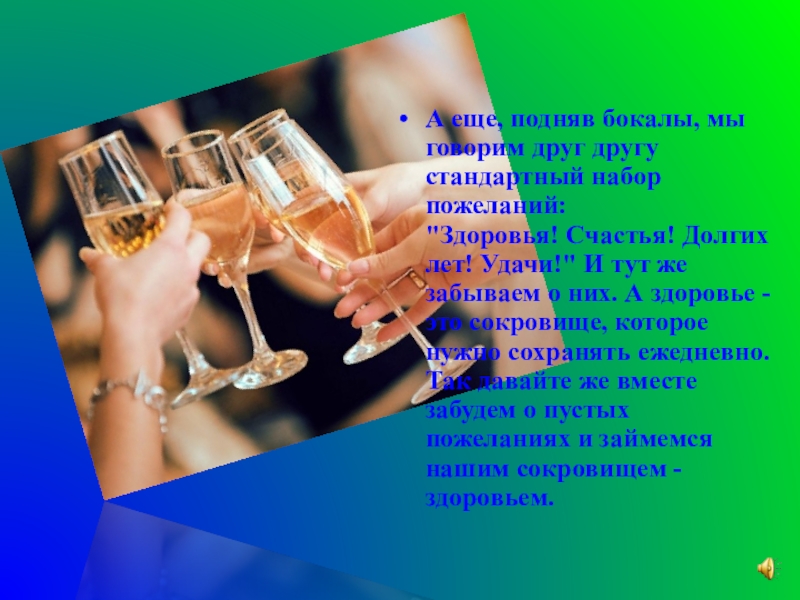 Слайд 3А еще, подняв бокалы, мы говорим друг другу стандартный набор пожеланий: