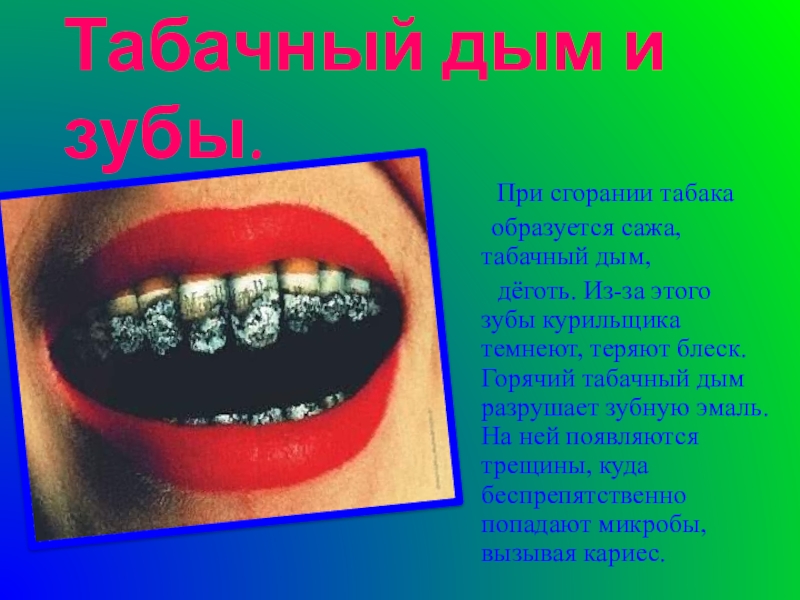 дёготь. Из-за этого зубы курильщика темнеют, теряют блеск. Горячий табачный дым разрушает зубную эмаль.На ней появляются трещины, куда беспрепятственно попадают микробы, вызывая кариес.