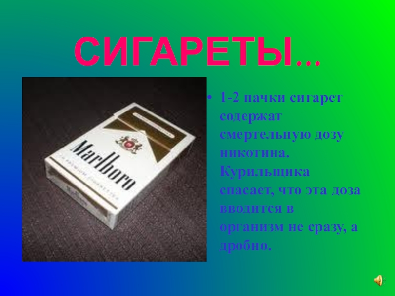 1-2 пачки сигарет содержат смертельную дозу никотина. Курильщика спасает, что эта