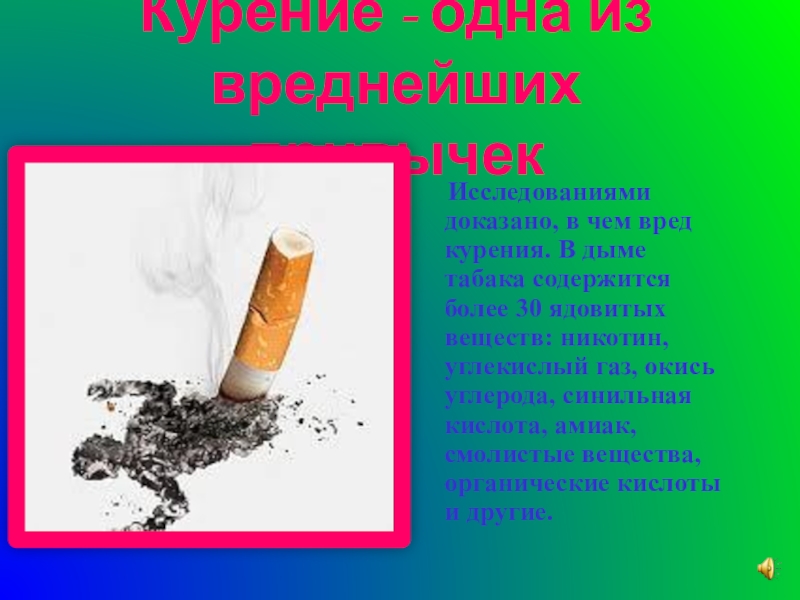 в чем вред курения. В дыме табака содержится более 30 ядовитых веществ: никотин, углекислый газ, окись углерода, синильная кислота, амиак, смолистые вещества, органические кислоты и другие.