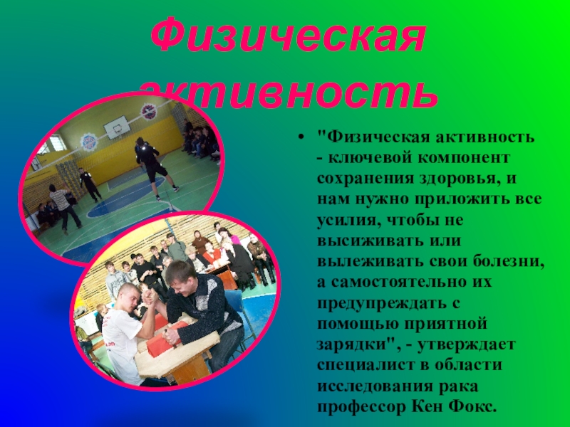 приложить все усилия, чтобы не высиживать или вылеживать свои болезни, а самостоятельно их предупреждать с помощью приятной зарядки", - утверждает специалист в области исследования рака профессор Кен Фокс.
