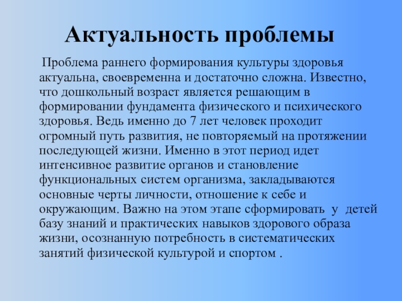 своевременна и достаточно сложна. Известно, что дошкольный возраст является решающим в формировании фундамента физического и психического здоровья. Ведь именно до 7 лет человек проходит огромный путь развития, не повторяемый на протяжении последующей жизни. Именно в этот период идет интенсивное развитие органов и становление функциональных систем организма, закладываются основные черты личности, отношение к себе и окружающим. Важно на этом этапе сформировать у детей базу знаний и практических навыков здорового образа жизни, осознанную потребность в систематических занятий физической культурой и спортом .