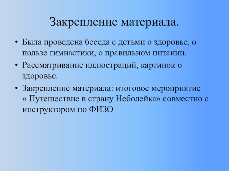 Закрепление материала: итоговое мероприятие « Путешествие в страну Неболейка» совместно с инструктором по ФИЗО