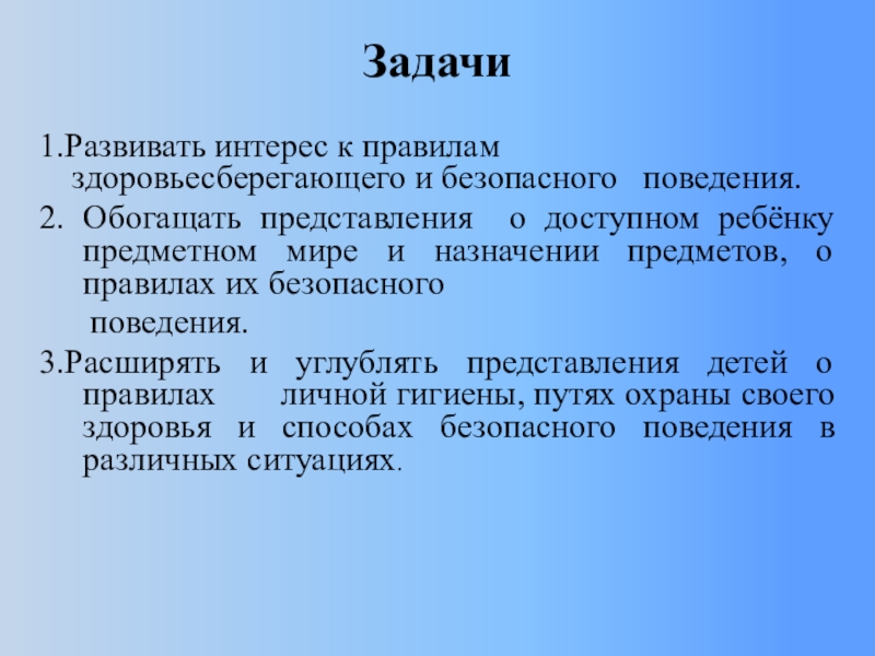 1.Развивать интерес к правилам здоровьесберегающего и безопасного поведения.