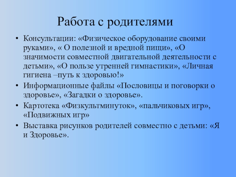вредной пищи», «О значимости совместной двигательной деятельности с детьми», «О пользе утренней гимнастики», «Личная гигиена –путь к здоровью!»
