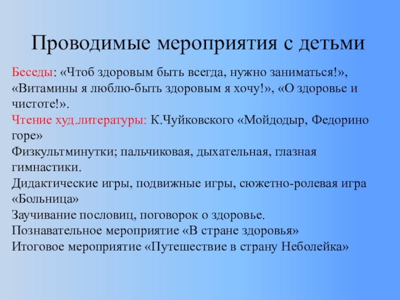 Итоговое мероприятие «Путешествие в страну Неболейка»