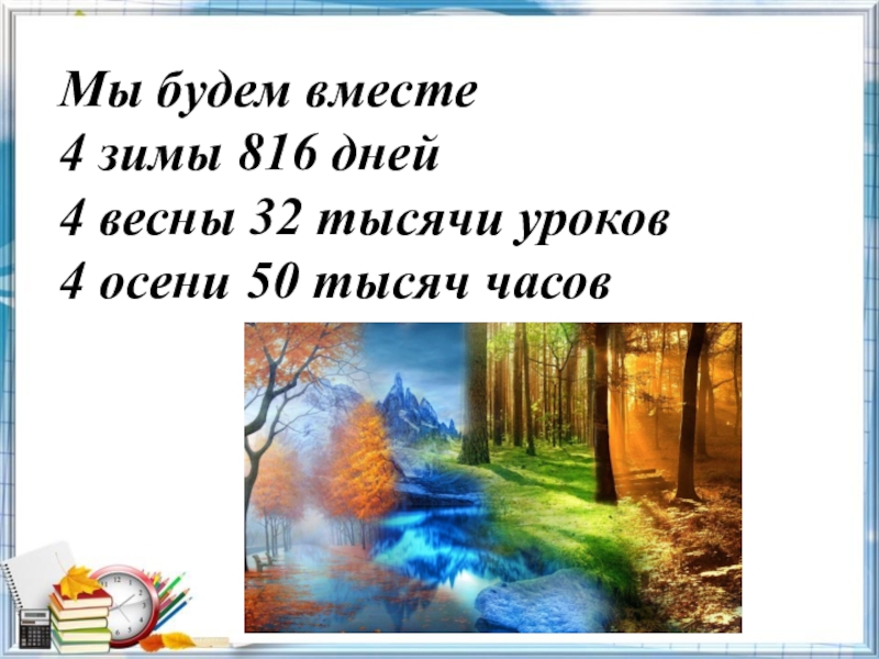 Мы будем вместе 4 зимы 816 дней  4 весны 32 тысячи уроков  4 осени 50 тысяч часов