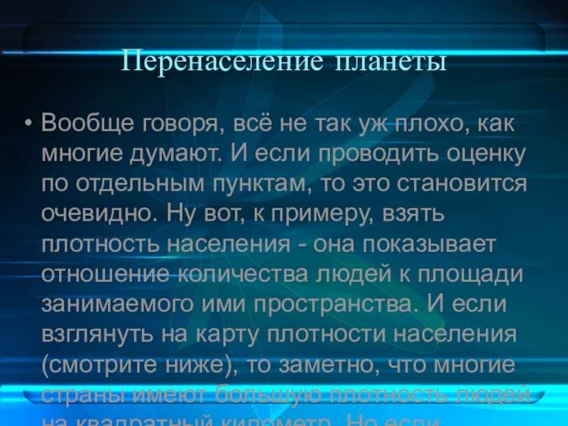 Перенаселение планеты Вообще говоря, всё не так уж плохо, как многие думают. И если проводить оценку по