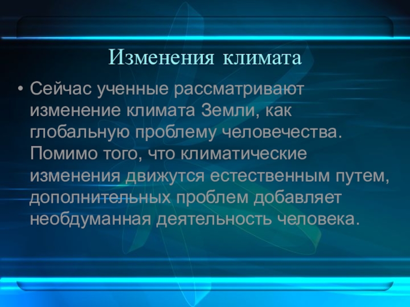 Изменения климатаСейчас ученные рассматривают изменение климата Земли, как глобальную проблему человечества. Помимо того, что климатические изменения движутся естественным путем, дополнительных проблем добавляет необдуманная деятельность человека.