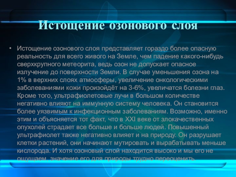 всего живого на Земле, чем падение какого-нибудь сверхкрупного метеорита, ведь озон не допускает опасное излучение до поверхности Земли. В случае уменьшения озона на 1% в верхних слоях атмосферы, увеличение онкологическими заболеваниями кожи произойдёт на 3-6%, увеличатся болезни глаз. Кроме того, ультрафиолетовые лучи в большом количестве негативно влияют на иммунную систему человека. Он становится более уязвимым к инфекционным заболеваниям. Возможно, именно этим и объясняется тот факт, что в XXI веке от злокачественных опухолей страдает все больше и больше людей. Повышенный ультрафиолет также негативно влияет и на природу. Он разрушает клетки растений, они начинают мутировать и вырабатывать меньше кислорода. И хотя озоновый слой находится высоко и мы его не ощущаем, значение его для природы трудно переоценить.