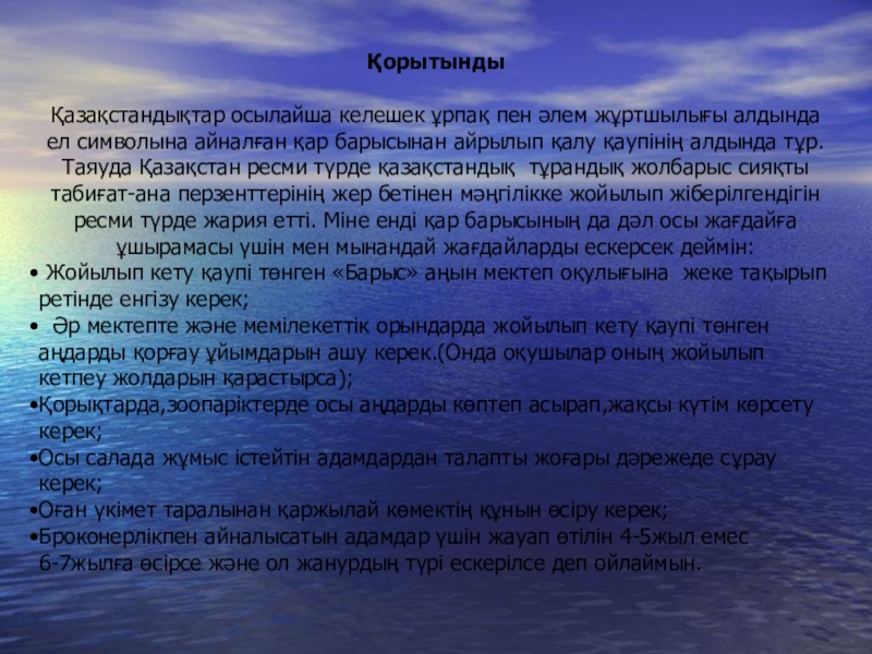 Жойылып кету қаупі төнген «Барыс» аңын мектеп оқулығына жеке тақырып ретінде енгізу керек;
