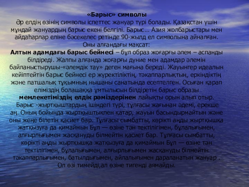 Барыс- ел символы. Ол ертеден бері қолданалып келе жатқан белгінің бірі. Әр елде ол әр мағынада белгіленеді. Ең басты мағынасы – оның мінезінің қайраттылығы.