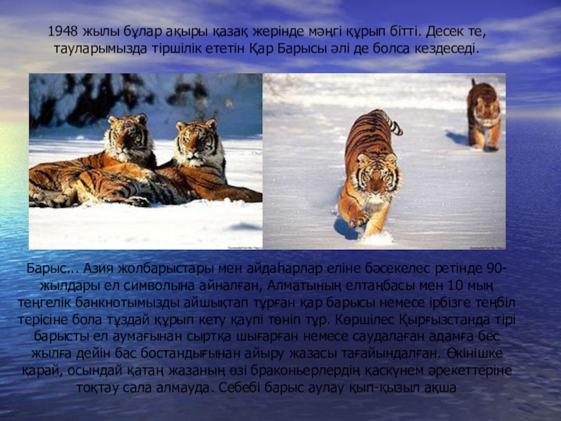 Мен осы зерттеу жұмысым арқылы барыс аңын жан – жақты зерттей отырып, оның негізгі сырларын ашамын деп ойлаймын. Сондықтан да, осы жұмысты зейін қойып оқуларыңызды өтінемін!