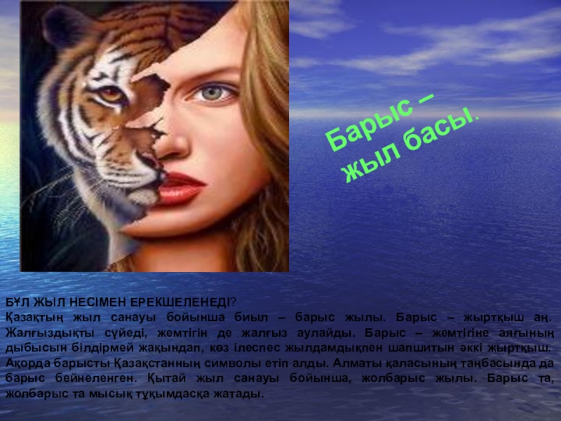 – барыс жылы. Барыс – жыртқыш аң. Жалғыздықты сүйедi, жемтiгiн де жалғыз аулайды. Барыс – жемтiгiне аяғының дыбысын бiлдiрмей жақындап, көз iлеспес жылдамдықпен шапшитын әккi жыртқыш. Ақорда барысты Қазақстанның символы етiп алды. Алматы қаласының таңбасында да барыс бейнеленген. Қытай жыл санауы бойынша, жолбарыс жылы. Барыс та, жолбарыс та мысық тұқымдасқа жатады.