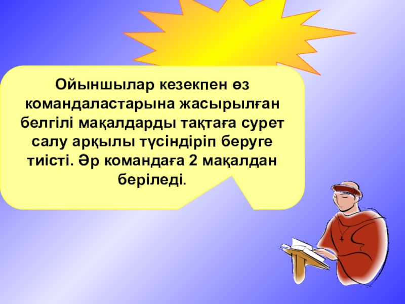 салу арқылы түсіндіріп беруге тиісті. Әр командаға 2 мақалдан беріледі.