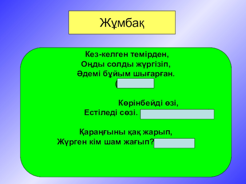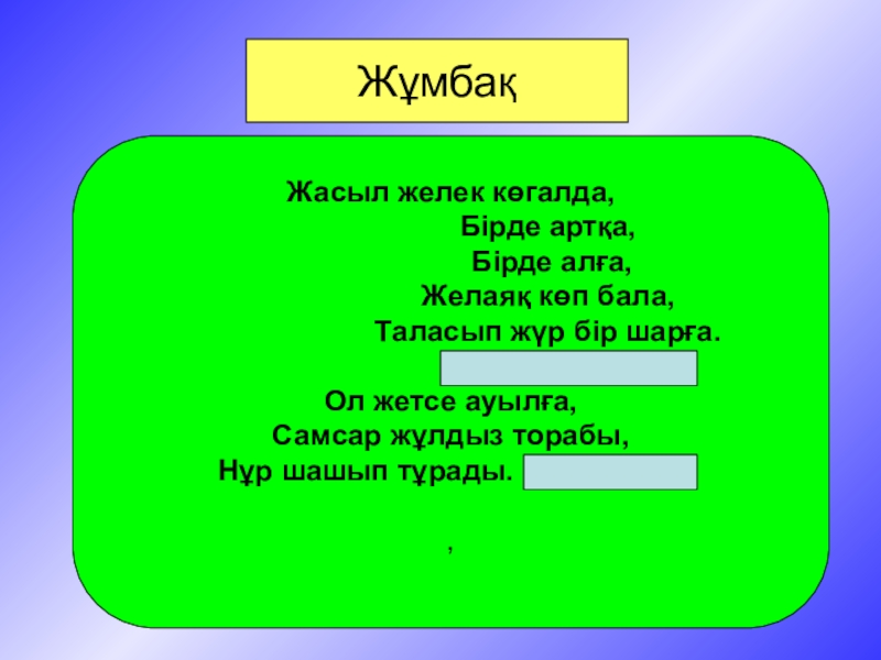 Жұмбақ  Жасыл желек көгалда,            Бiрде