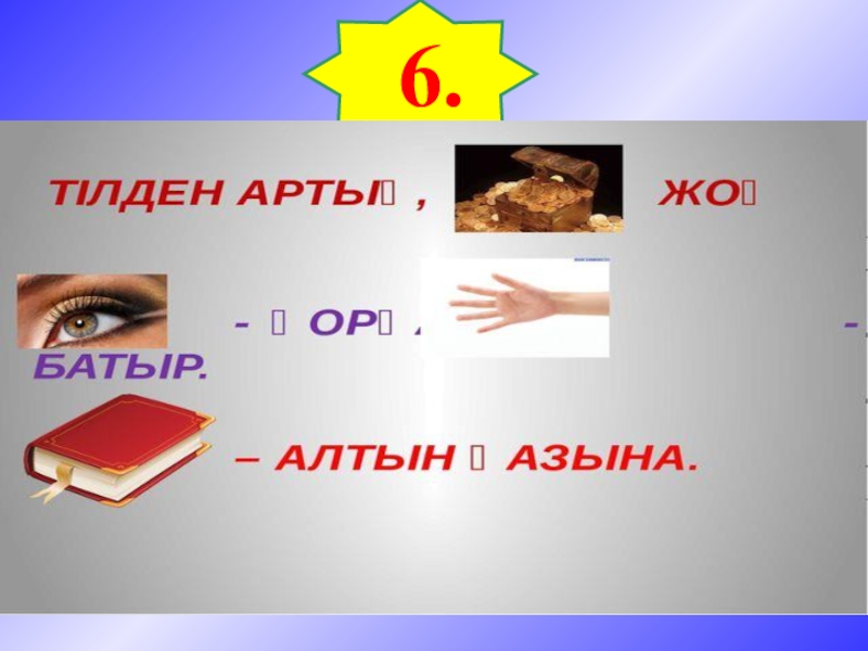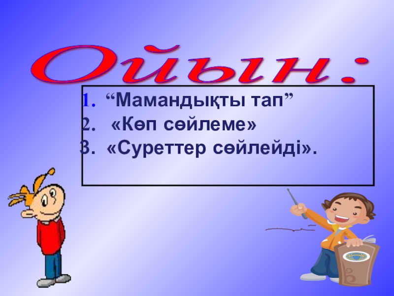 «Суреттер сөйлейді». 0Ойыншылар кезекпен өз командаластарына жасырылған белгілі мақалдарды тақтаға сурет салу арқылы түсіндіріп беруге тиісті. Әр