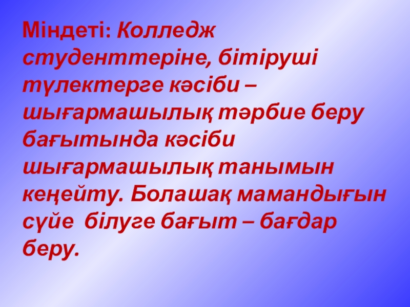 Слайд 3Міндеті: Колледж студенттеріне, бітіруші түлектерге кәсіби – шығармашылық тәрбие беру бағытында кәсіби