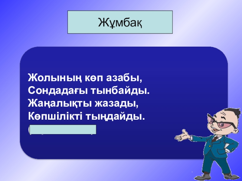 Жұмбақ  Жолының көп азабы, Сондадағы тынбайды.Жаңалықты жазады,Көпшiлiктi тыңдайды.   (Журналист)