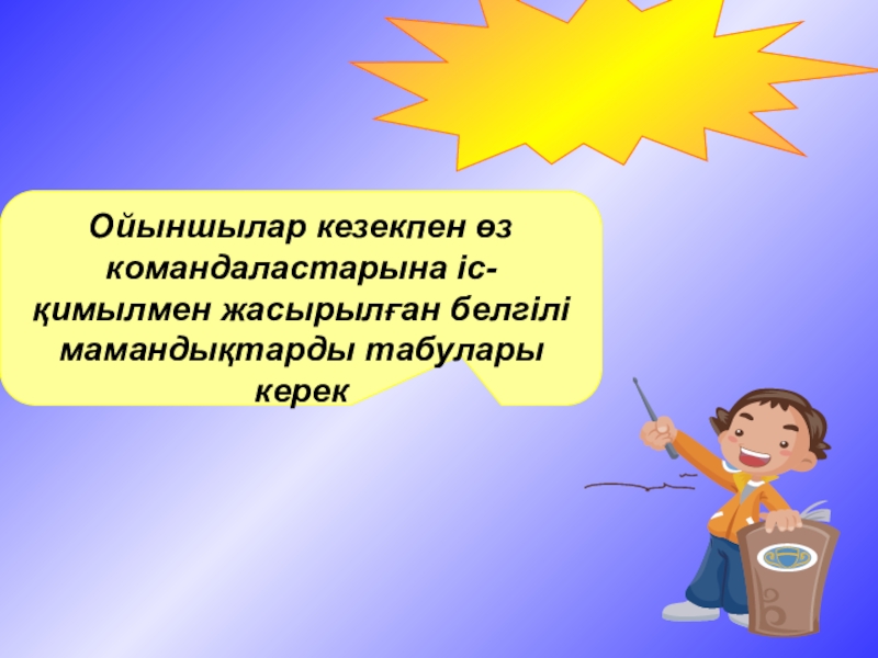 «Көп сөйлеме». 0Ойыншылар кезекпен өз командаластарына іс-қимылмен жасырылған белгілі мамандықтарды табулары керек