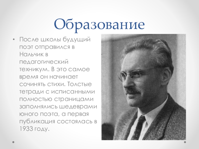 ОбразованиеПосле школы будущий поэт отправился в Нальчик в педагогический техникум. В это самое время он начинает сочинять