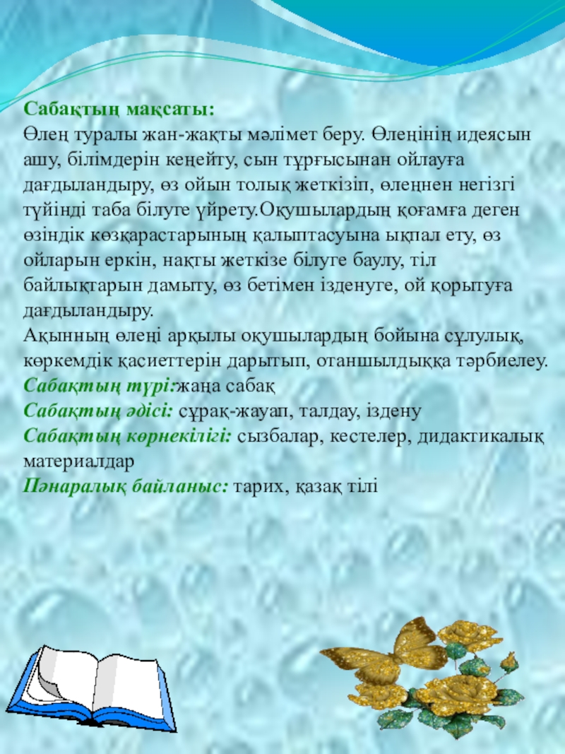 Сабақтың мақсаты:Өлең туралы жан-жақты мәлімет беру. Өлеңінің идеясын ашу, білімдерін кеңейту, сын тұрғысынан ойлауға дағдыландыру, өз ойын