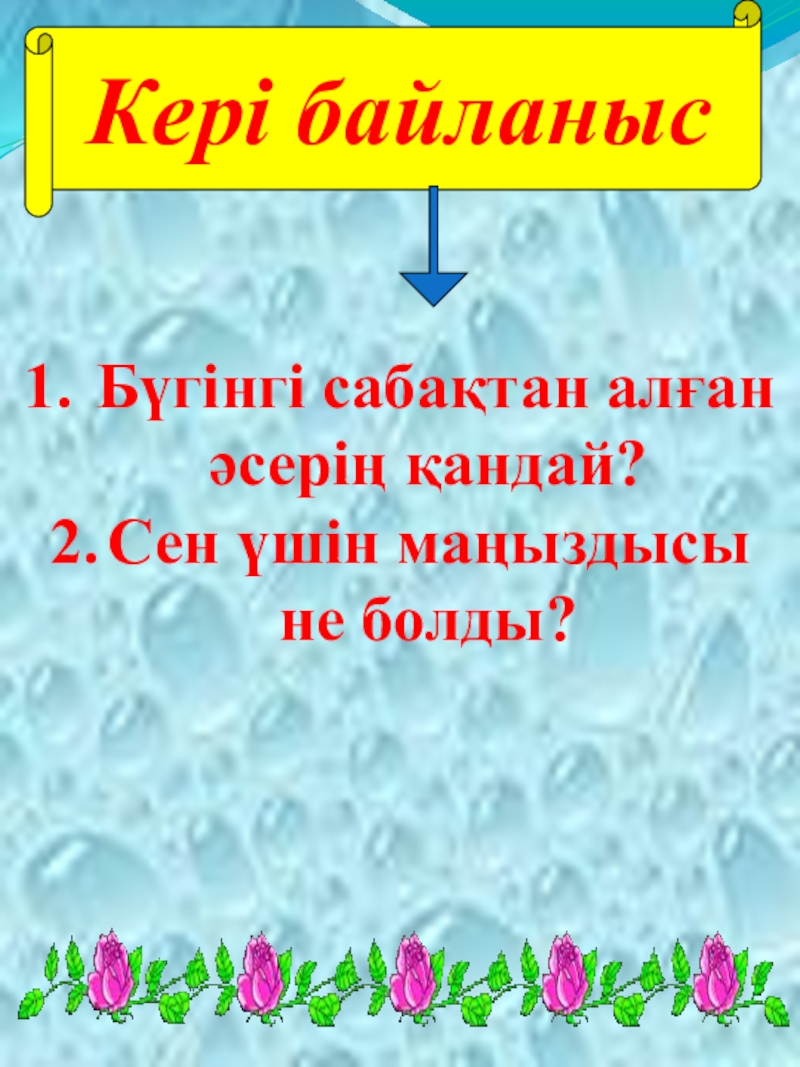 Кері байланыс Бүгінгі сабақтан алған әсерің қандай?Сен үшін маңыздысы не болды?