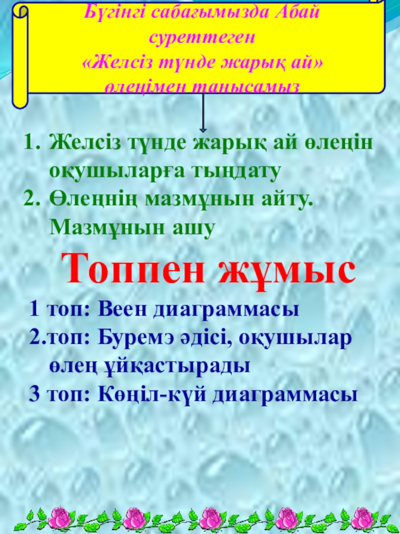 Бүгінгі сабағымызда Абай суреттеген«Желсіз түнде жарық ай» өлеңімен танысамыз  Желсіз түнде жарық ай өлеңін оқушыларға тыңдатуӨлеңнің