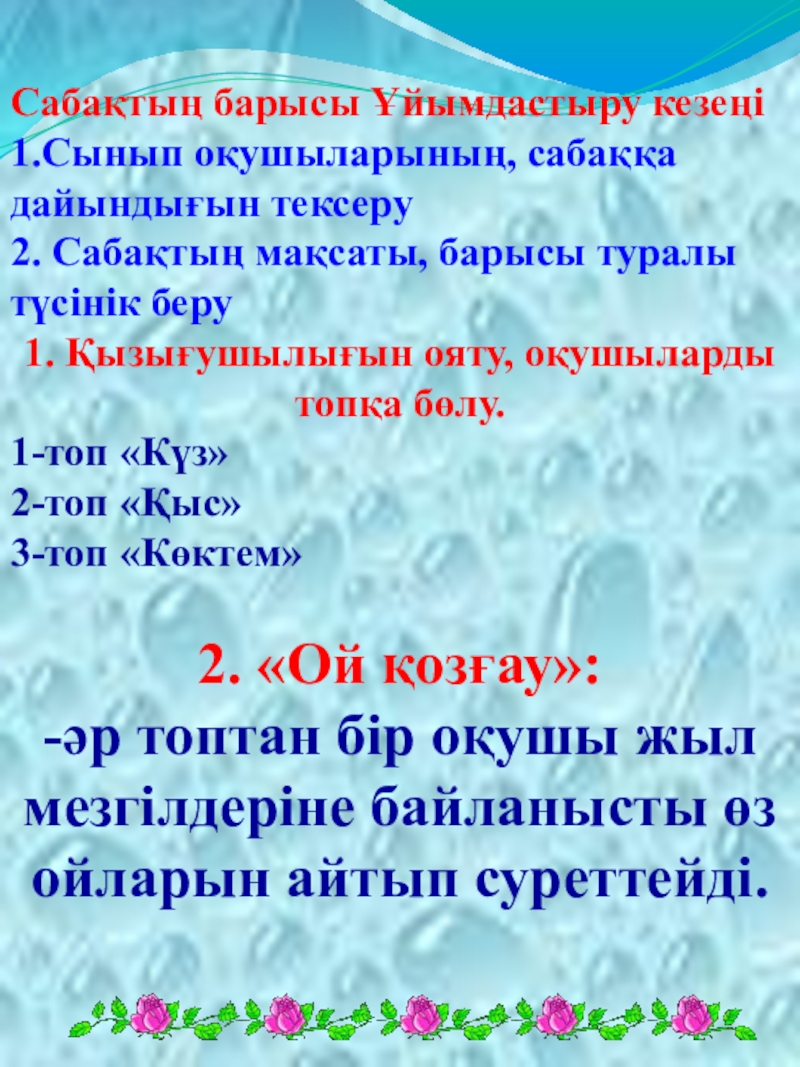 -әр топтан бір оқушы жыл мезгілдеріне байланысты өз ойларын айтып суреттейді.