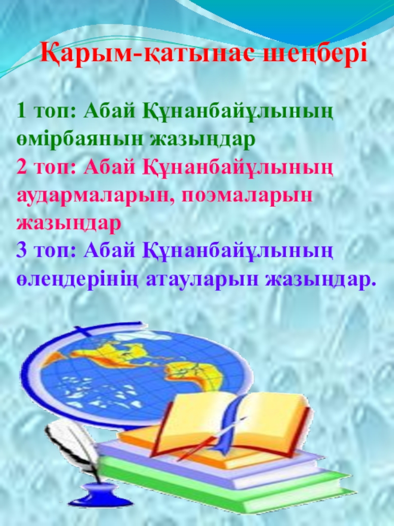 Қарым-қатынас шеңбері1 топ: Абай Құнанбайұлының өмірбаянын жазыңдар2 топ: Абай Құнанбайұлының аудармаларын, поэмаларын жазыңдар3 топ: Абай Құнанбайұлының өлеңдерінің