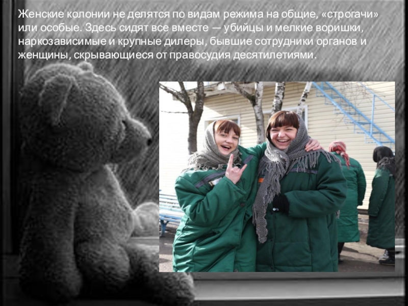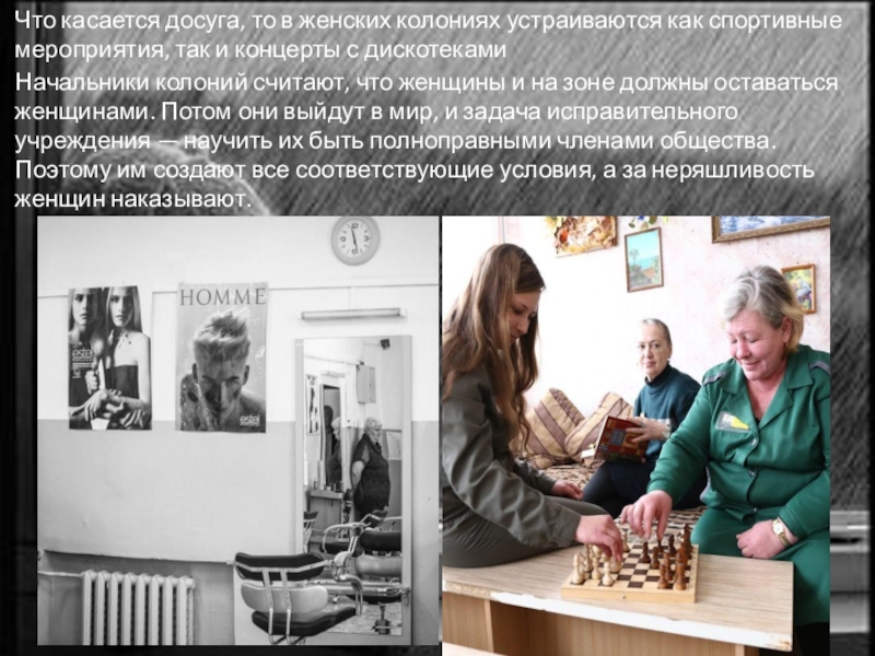 Начальники колоний считают, что женщины и на зоне должны оставаться женщинами. Потом они выйдут в мир, и задача исправительного учреждения — научить их быть полноправными членами общества. Поэтому им создают все соответствующие условия, а за неряшливость женщин наказывают.
