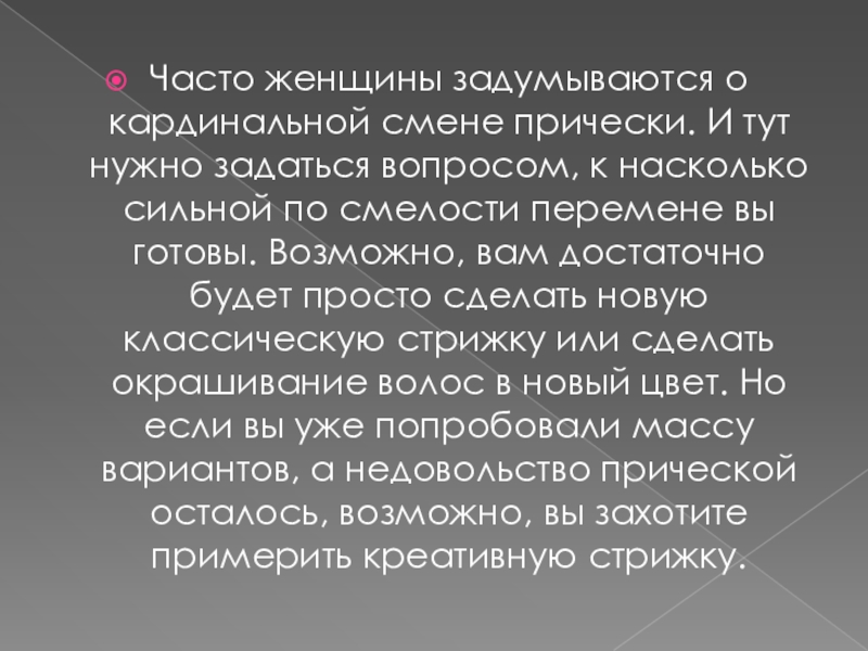 Слайд 2Часто женщины задумываются о кардинальной смене прически. И тут нужно задаться