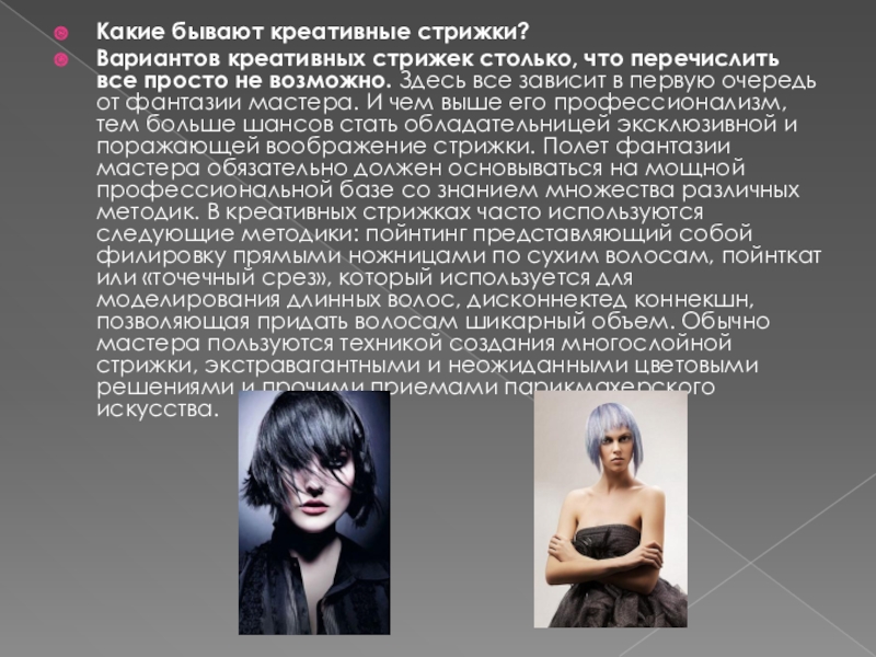 не возможно. Здесь все зависит в первую очередь от фантазии мастера. И чем выше его профессионализм, тем больше шансов стать обладательницей эксклюзивной и поражающей воображение стрижки. Полет фантазии мастера обязательно должен основываться на мощной профессиональной базе со знанием множества различных методик. В креативных стрижках часто используются следующие методики: пойнтинг представляющий собой филировку прямыми ножницами по сухим волосам, пойнткат или «точечный срез», который используется для моделирования длинных волос, дисконнектед коннекшн, позволяющая придать волосам шикарный объем. Обычно мастера пользуются техникой создания многослойной стрижки, экстравагантными и неожиданными цветовыми решениями и прочими приемами парикмахерского искусства.