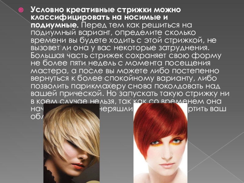 Слайд 7Условно креативные стрижки можно классифицировать на носимые и подиумные. Перед тем как