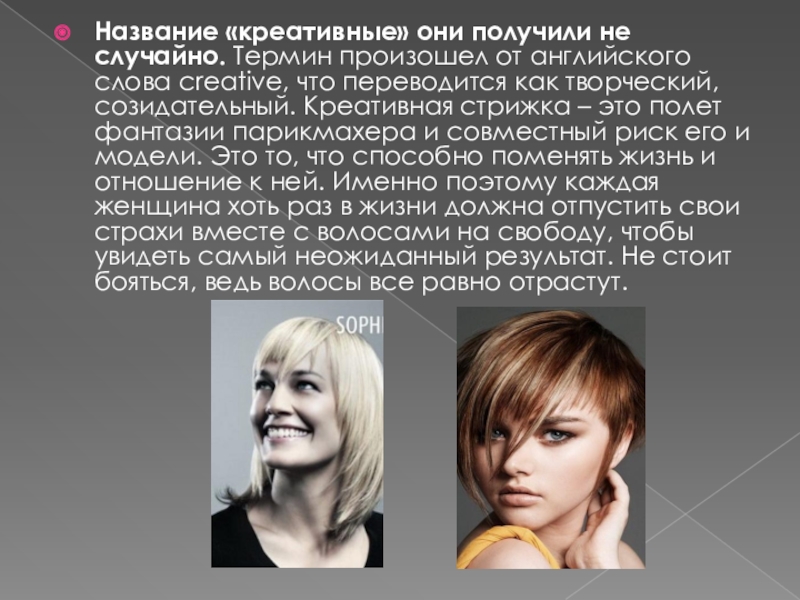 что переводится как творческий, созидательный. Креативная стрижка – это полет фантазии парикмахера и совместный риск его и модели. Это то, что способно поменять жизнь и отношение к ней. Именно поэтому каждая женщина хоть раз в жизни должна отпустить свои страхи вместе с волосами на свободу, чтобы увидеть самый неожиданный результат. Не стоит бояться, ведь волосы все равно отрастут.