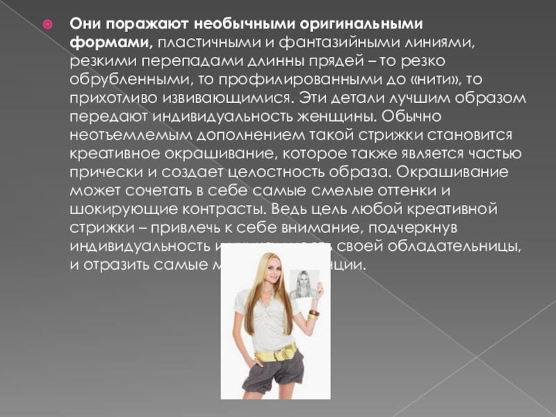 прядей – то резко обрубленными, то профилированными до «нити», то прихотливо извивающимися. Эти детали лучшим образом передают индивидуальность женщины. Обычно неотъемлемым дополнением такой стрижки становится креативное окрашивание, которое также является частью прически и создает целостность образа. Окрашивание может сочетать в себе самые смелые оттенки и шокирующие контрасты. Ведь цель любой креативной стрижки – привлечь к себе внимание, подчеркнув индивидуальность и уникальность своей обладательницы, и отразить самые модные тенденции.