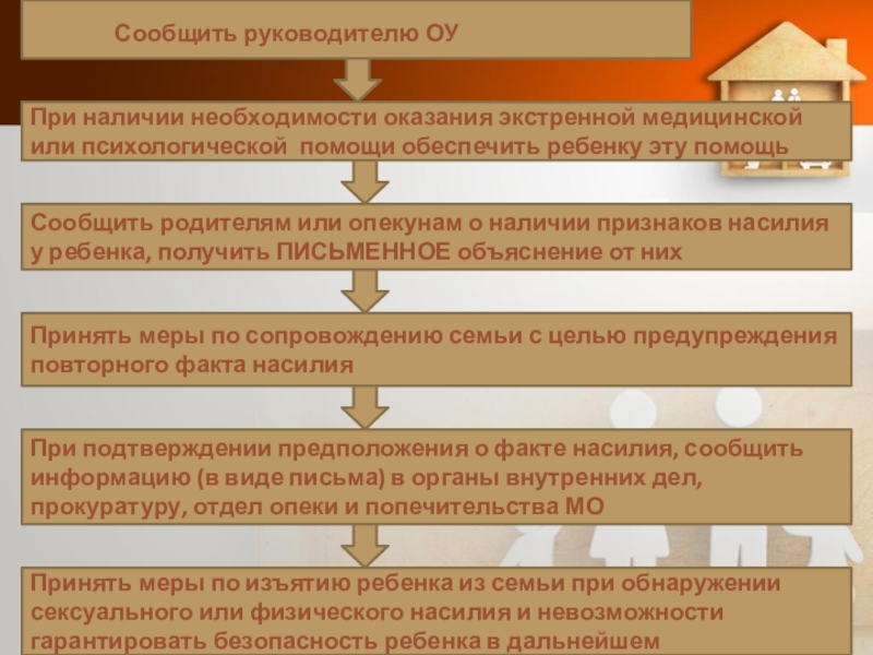 При подтверждении предположения о факте насилия, сообщить информацию (в виде письма) в органы внутренних дел, прокуратуру, отдел опеки и попечительства МО