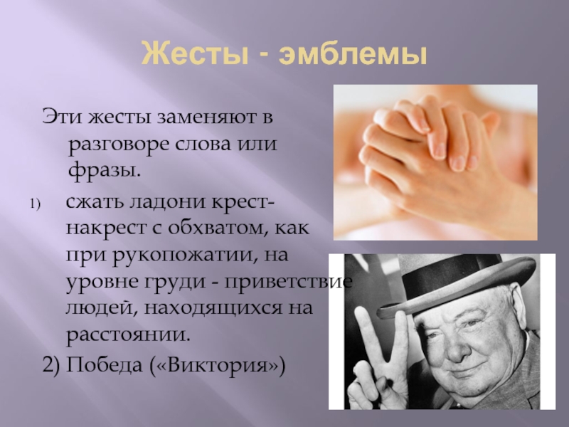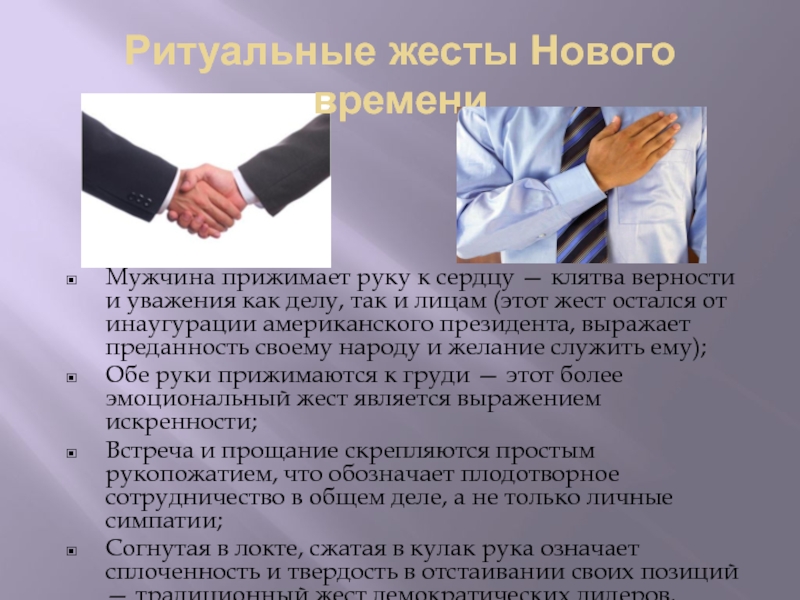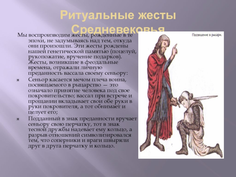 над тем, откуда они произошли. Эти жесты рождены нашей генетической памятью (поцелуй, рукопожатие, вручение подарков). Жесты, возникшие в феодальные времена, отражали личную преданность вассала своему сеньору: