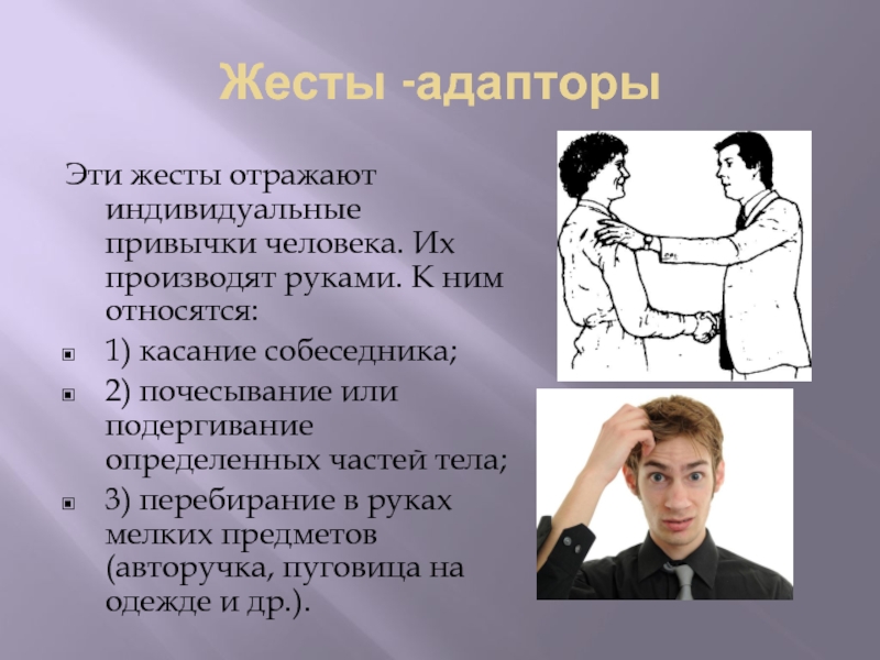 Эти жесты отражают индивидуальные привычки человека. Их производят руками. К