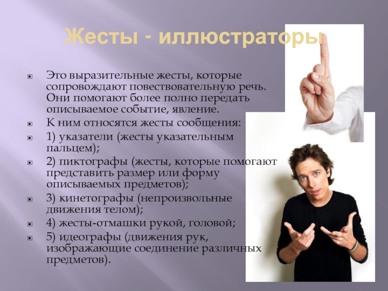 2) пиктографы (жесты, которые помогают представить размер или форму описываемых предметов);